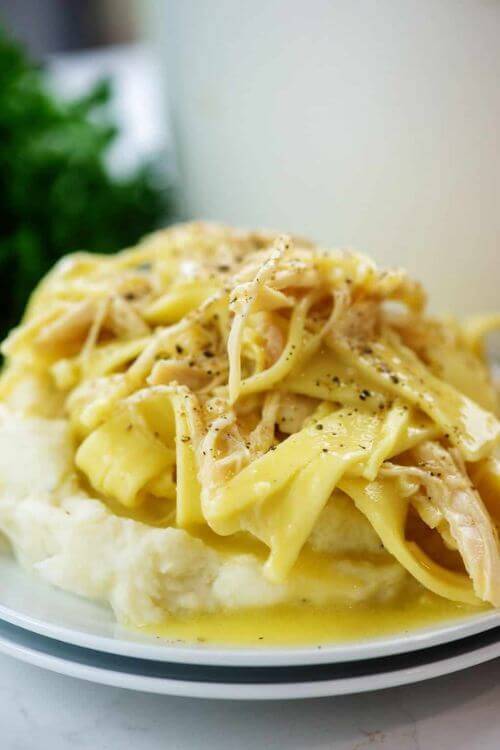 The ingredients include chicken, egg noodles, chicken base, salt, and pepper. The recipe is best served with mashed potatoes.