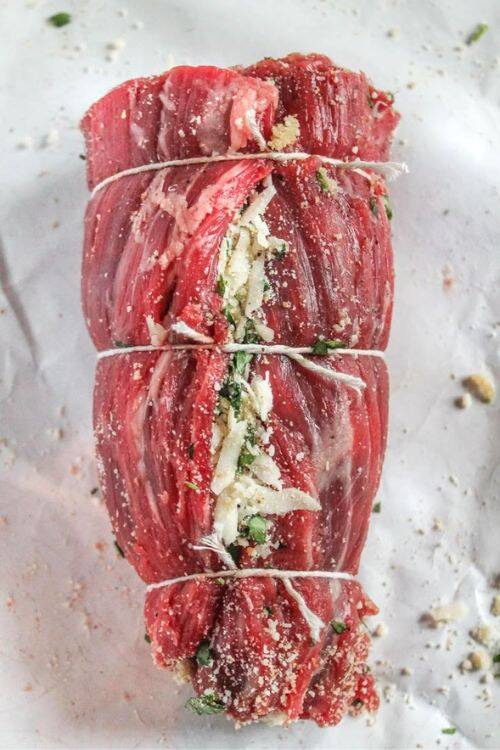 The ingredients include flank steak, Italian breadcrumbs, tomato sauce, white wine and butter.