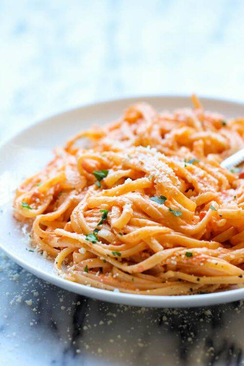 The ingredients include linguine, parmesan cheese, roasted red peppers, goat cheese and heavy cream.