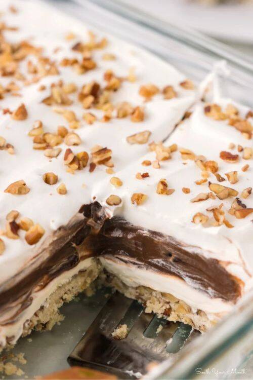 The ingredients include all-purpose flour, Instant chocolate pudding, butter, cream cheese, Cool Whip and pecans. Keep the leftovers in an airtight container in the fridge, and it will be good for 5 days.