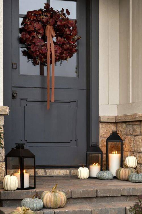 One of the best-looking fall decorations for outdoors, this looks splendid. In the evening, it looks even better with lights. Decorate the front porch with pumpkins and flowers. Place small candles on either side of the staircase.