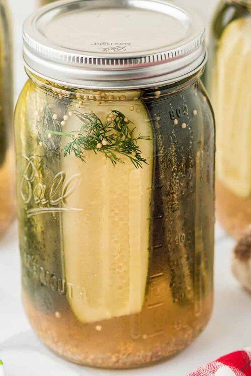 These ingredients include apple cider vinegar, pickling cucumbers, yellow mustard seed, fresh dill, garlic and canning salt.