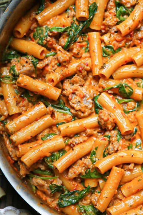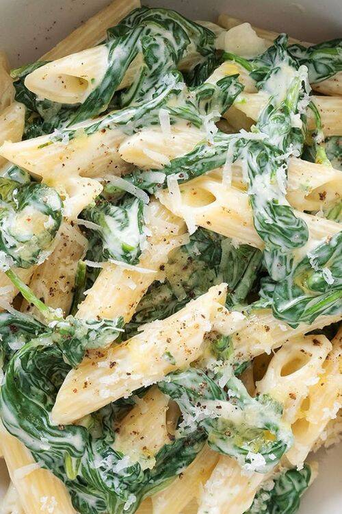 The ingredients include pasta, cream cheese, baby spinach, garlic and parmesan cheese.