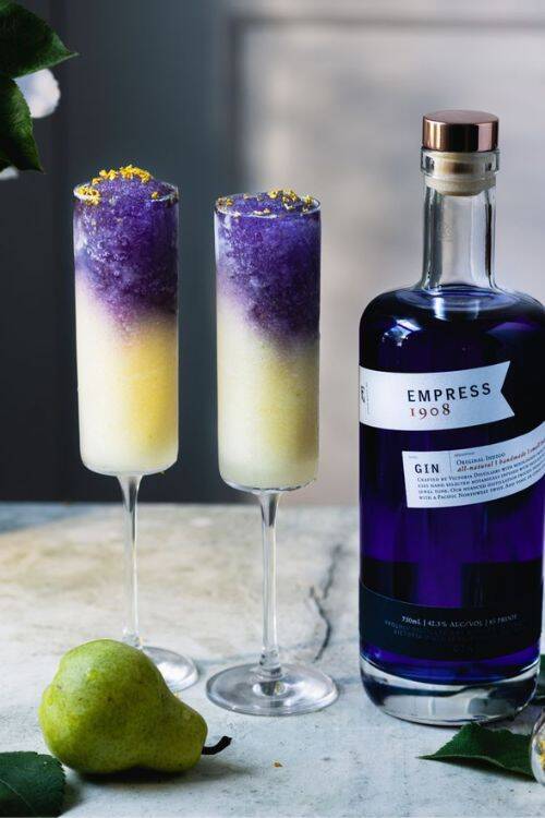The ingredients include violet syrup, Empress gin, pear, honey, and floral bitters.