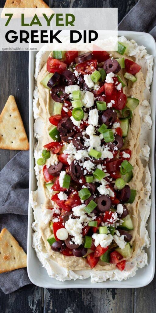 This 7-layer dip contains kalamata olives, hummus, red onions, tomatoes, lemon, feta cheese, cucumber, and garlic-lemon Greek yogurt.