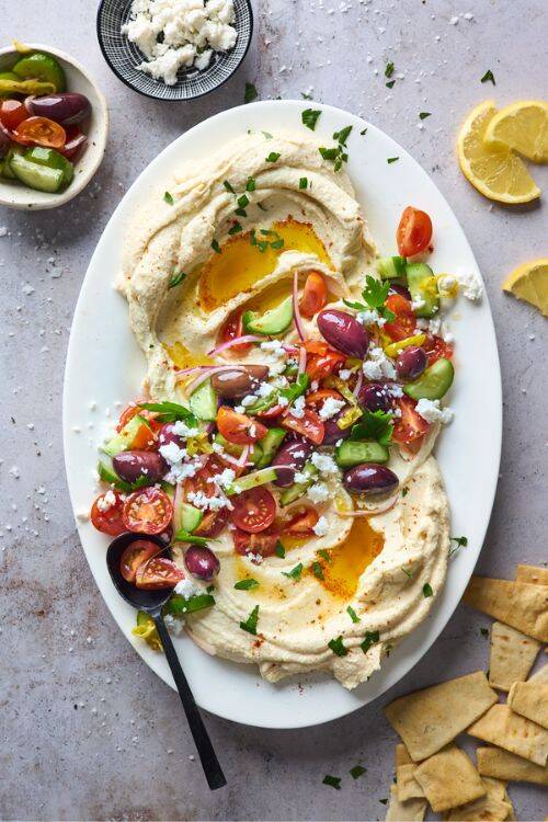 The ingredients include hummus, oregano, red onion, cherry tomatoes and kalamata olives.