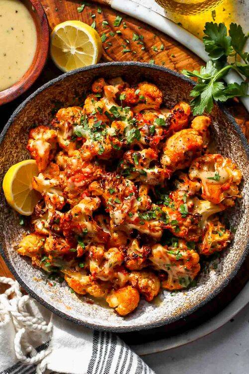 The ingredients include mild harissa, tahini, black pepper, lemon juice and cauliflower.