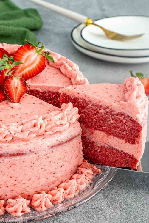 This strawberry-flavored sheet cake with creamy frosting is mesmerizing. Preheat the oven to 350°F and bake it for half an hour. A sheet cake is usually made to feed a big group of people.