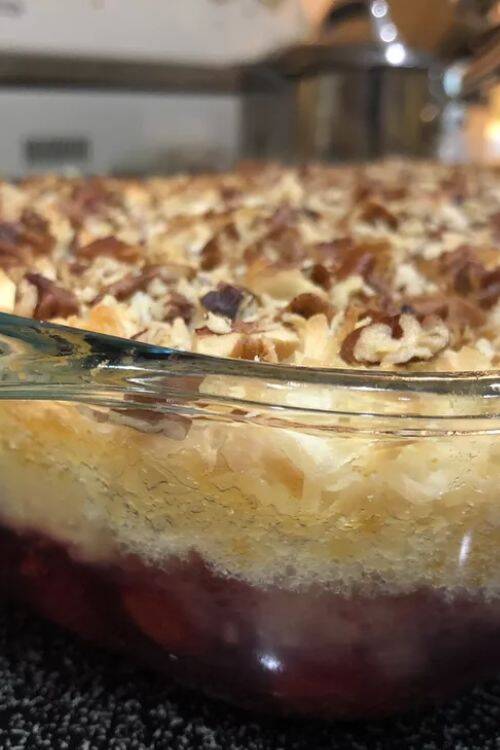 The ingredients include cherry pie filling, pecan, butter cake mix, margarine and flaked coconut.