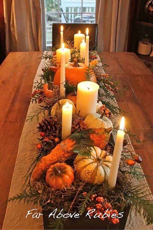 It is one of the easiest Thanksgiving centerpieces to make. You just need faux greenery and candles and arrange them in the way shown in the picture above. You can light the candles or keep them as it is.